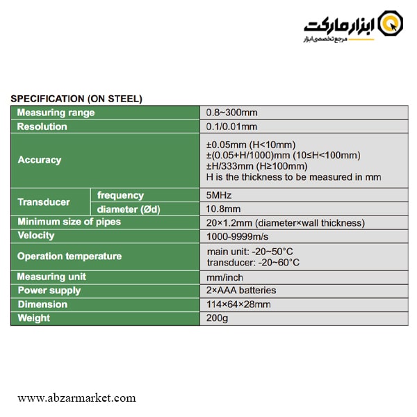 - رزولوشن صفحه نمایش دیجیتال 0.01 میلی متر برای ضخامت کمتر از 100 میلی متر / رزولوشن 0.1 میلی متر برای ضخامتهای بالاتر از 100 میلی متر