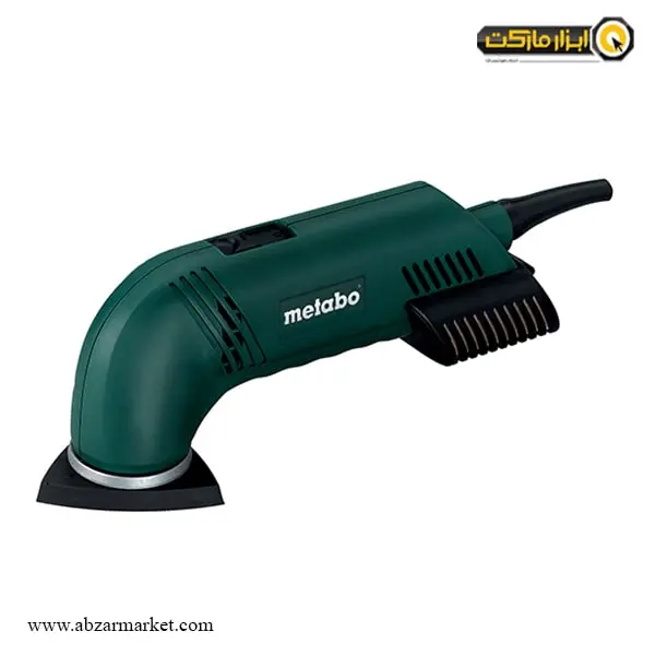 در بخش پشتی دستگاه، فیلتر و کارتریج جذب گرد و غبار تعبیه شده است تا بتوان بدون اتصال به مکنده صنعتی نیز محیط کاری تمیز و عاری از ذرات ریز داشت. بر روی بدنه، کلید دیمر تنظیم سرعت قرار دارد که کاربر میتواند با آن سرعت حرکت لرزشی پد سنباده را متناسب با جنس سطح کار تنظیم کند. طراحی سه گوش کف صفحه سنباده به ویژه برای پرداخت گوشهها، لبههای قابها و سطوح زاویه دار بسیار کارآمد است. ساختار کلی با رنگ سبز تیره متابو و کیفیت بالای بدنه پلاستیکی مقاوم در برابر فشار، جلوهای صنعتی و در عین حال مدرن به دستگاه داده است.