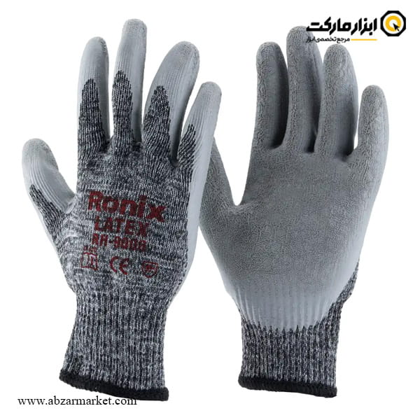 معرفی و مشخصات دستکش ایمنی رونیکس لاتکس کف مواد نیمه صنعتی طوسی (نخ ملانژ) مدل RH-9006
